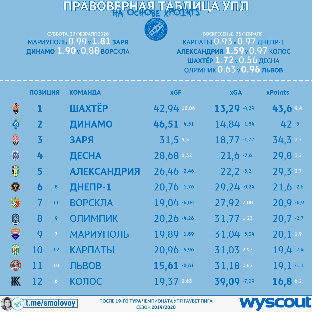 Блогер Михаил Смоловой в своем Telegram-канале поделился правоверной таблицей УПЛ на основе xPoints.