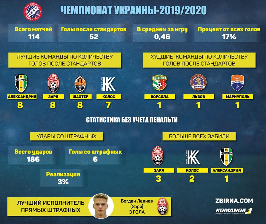 Таким образом, после 19-го тура по числу голов после стандартов Заря сравнялась с Шахтером и Александрией (тут без учета пенальти). В среднем за игру в УПЛ забивают чуть меньше 0,5 мяча после стандартных положений — 17% от всех голов. С прямыми штрафными — вообще все очень плохо. В сумме их было 186, а к голу приводила лишь каждая 33-я попытка. У Динамо и Шахтера, где собраны самые сильные исполнители, таких результативных выстрелов в нынешнем чемпионате еще не было!