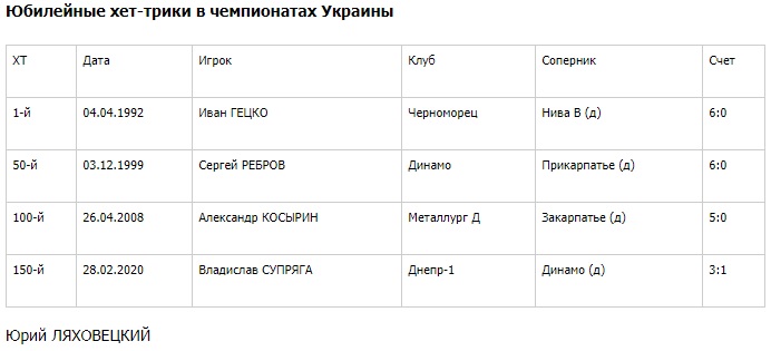 Возращаясь к юбилею, наибольшую коллекцию хет-триков собрали футболисты «Динамо - 33 и «Шахтера» - 22. Среди игроков чаще других исполняли «трюк со шляпой» Сергей Ребров - 6 и Жуниор Мораес - 5. Самый молодой автор хет-трика - Олег Ящук из тернопольской «Нивы» (17 лет 272 дня), самый возрастной - Александр Гайдаш из «Таврии» (35 лет 242 дня). Самый ранний хет-трик сделал тот же Александр Гайдаш, 7 сентября 1997 года забивший третий мяч «Торпедо» на 23-й минуте. А самый скоростной - Виталий Пушкуца из «Металлиста», который 7 мая 2002-го ухитрился трижды расписаться в воротах «Закарпатья» с интервалом в 4 минуты.