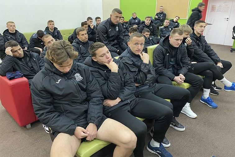 Перед тренировкой тренерский штаб, футболисты и персонал собрались в зале для теоретических занятий, где слово взял и.о. главного тренера Олимпика Игорь Климовский.