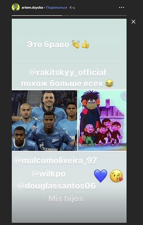 Нападающий «Зенита» Артем Дзюба выложил в инстаграме коллаж, где игроков клуба сравнили с персонажами мультфильма.