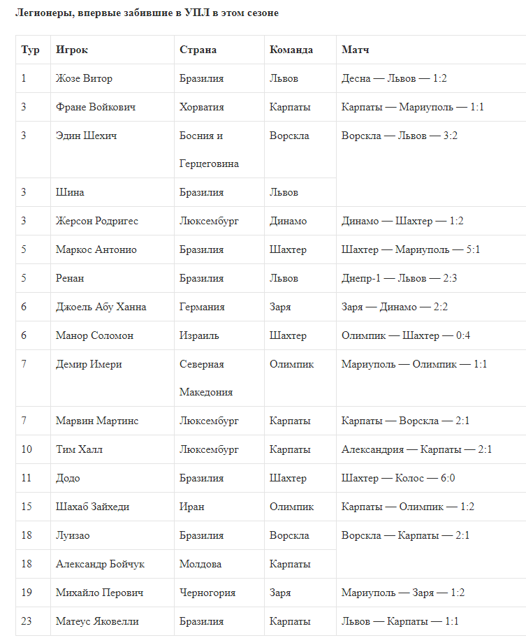 Эти легионеры представляют 10 стран. Больше всего дебютных голов оформили бразильцы (7), а второе место неожиданно заняли представители Люксембурга (3). Кроме того, в этом сезоне впервые в УПЛ отличились игроки из этой карликовой страны, а также Израиля (Манор Соломон) и Ирана (Шахаб Захеди).