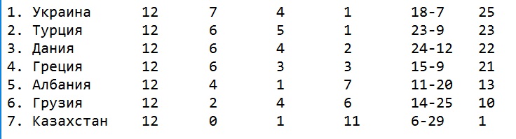 Тем не менее, несмотря на потерю двух очков, украинцы, а также турки возглавляли группу с пятью пунктами. У Дании было на очко и на матч меньше, так что по потерянным очкам впереди шли именно они.