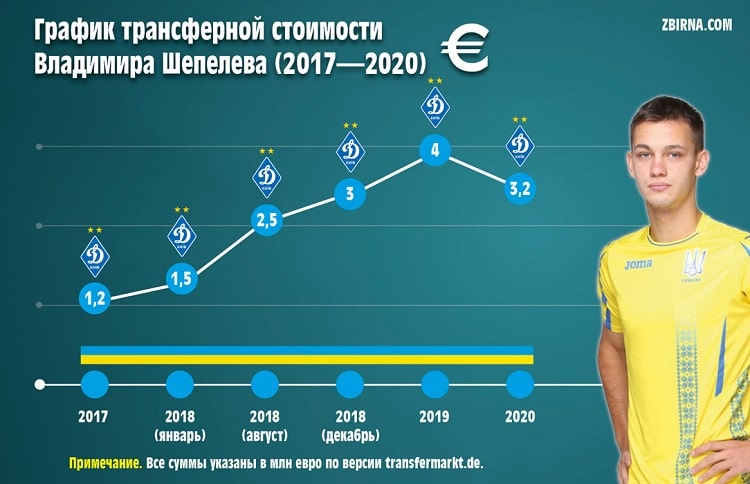 Сегодня мы посмотрим на график трансферной стоимости одного из самых перспективных украинских полузащитников, футболиста киевского Динамо и сборной Украины Владимира Шепелева.