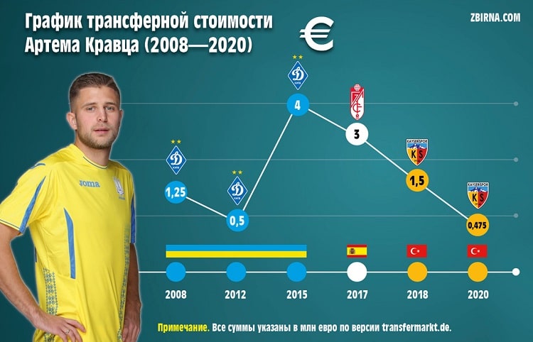 Сегодня мы взглянем на кривую трансферной стоимости нападающего турецкого Кайсериспора и сборной Украины Артема Кравца. Не сомневаемся, что, если бы не травмы, наш форвард к своим 30-ти годам имел бы более высокие вершины на этом графике.