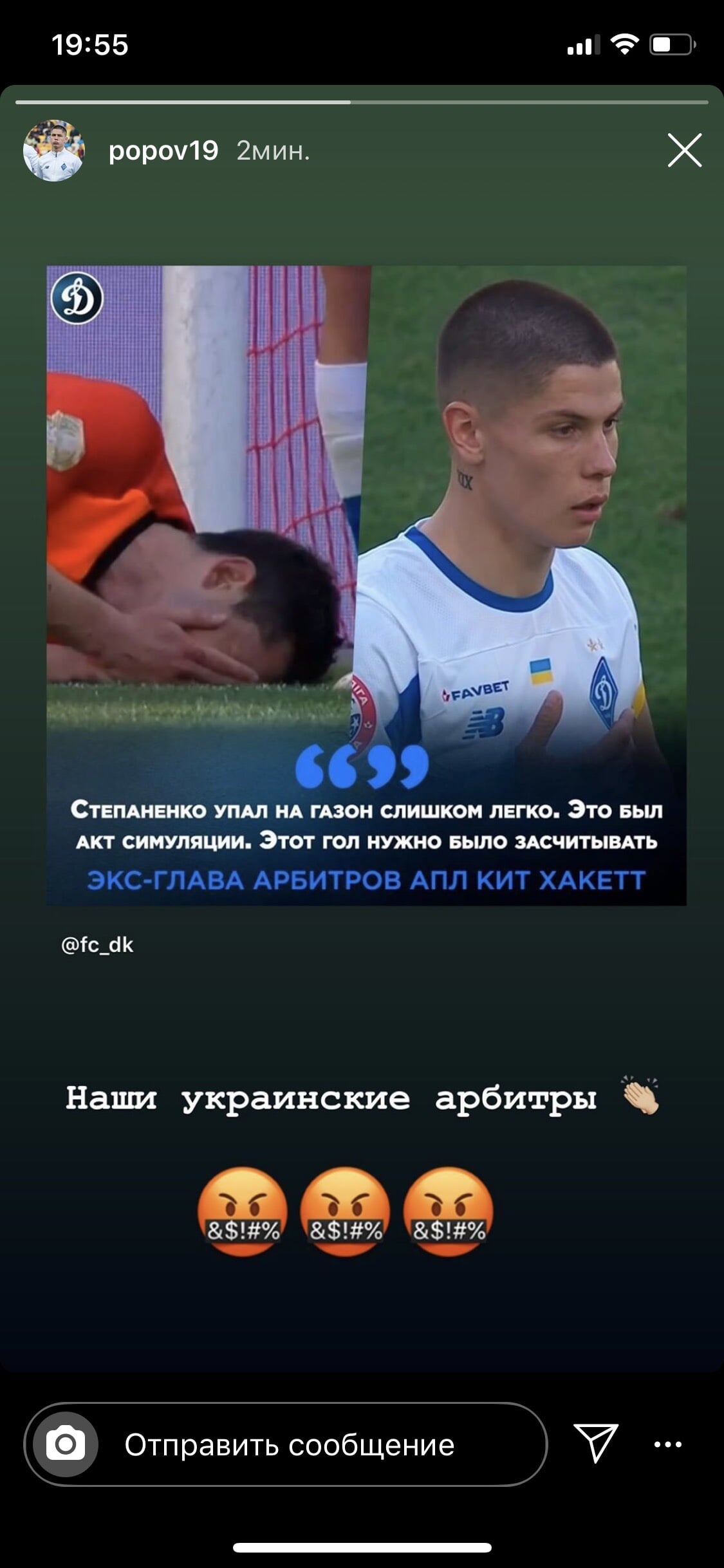 Защитник "Динамо" Денис Попов в своем Instagram прокомментировал эпизод в матче с "Шахтером", после которого арбитр встречи Катерина Монзуль отменила взятие ворот горняков.
