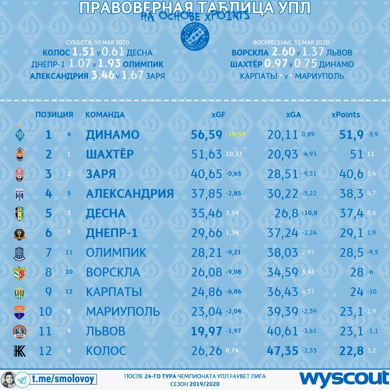 Блогер Михаил Смоловой в своем Телеграм-канале рассказывает о правоверной таблице УПЛ после 24-го тура.
