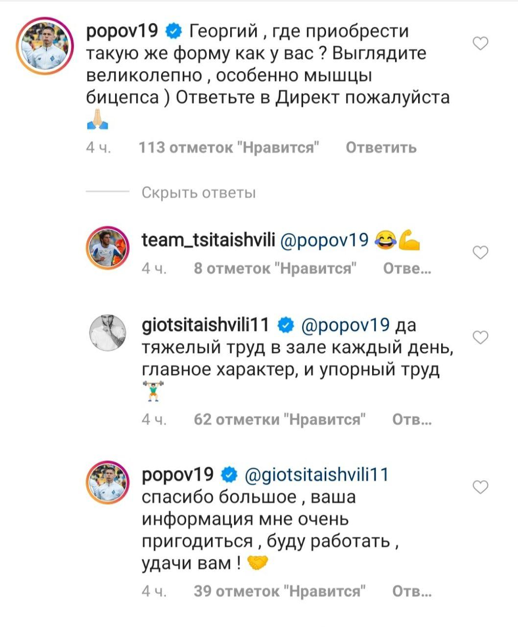 Защитник "Динамо" Денис Попов оставил свой комментарий под фото Георгия Цитаишвили в его Instagram, задав вопрос по поводу физической формы одноклубника.
