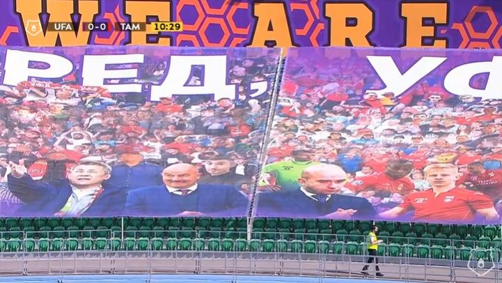 Матч проходит в Уфе при ограниченном количестве зрителей на трибунах. «Уфа» решила воспользоваться этим и сделала крупный баннер, который разместили на одном из секторов арены «Нефтяник».