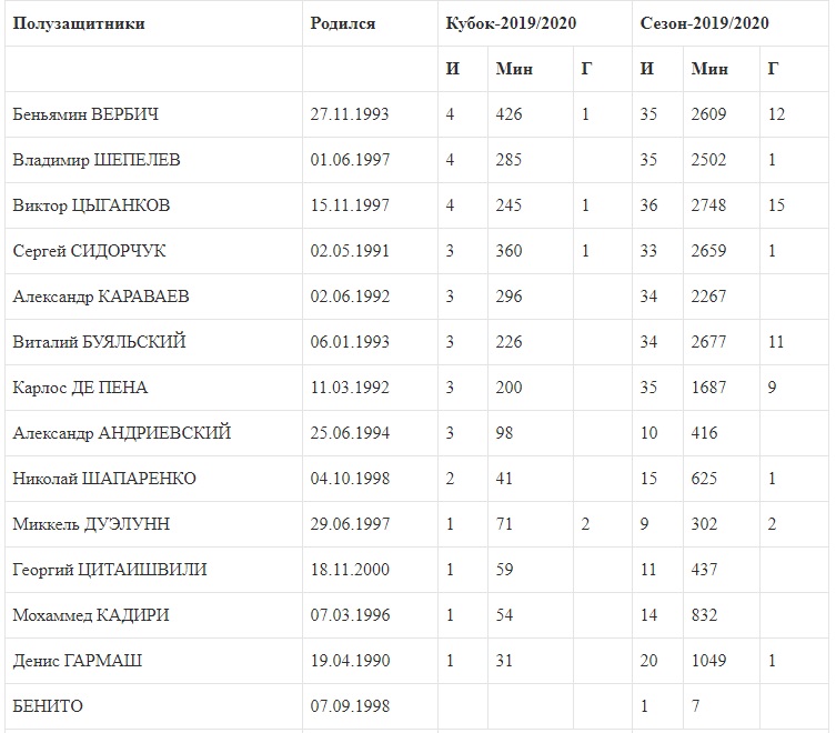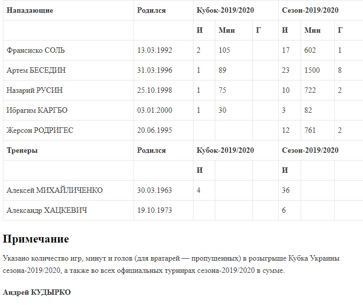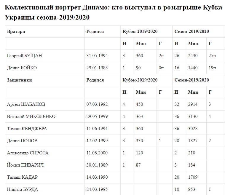 Приведем полный список футболистов Динамо, которые играли за основу. Один блок статистики — по итогам четырех матчей Кубка Украины. Второй — по сумме всех матчей во всех официальных турнирах сезона.