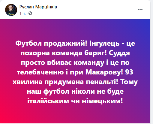 «Футбол продажный. «Ингулец» – позорная команда барыг. Судья просто убивает команду, и это по телевидению и при Макарове. 93-я минута – придуманный пенальти. Поэтому наш футбол никогда не будет итальянским или немецким», – написал Марцинкив в Facebook.
