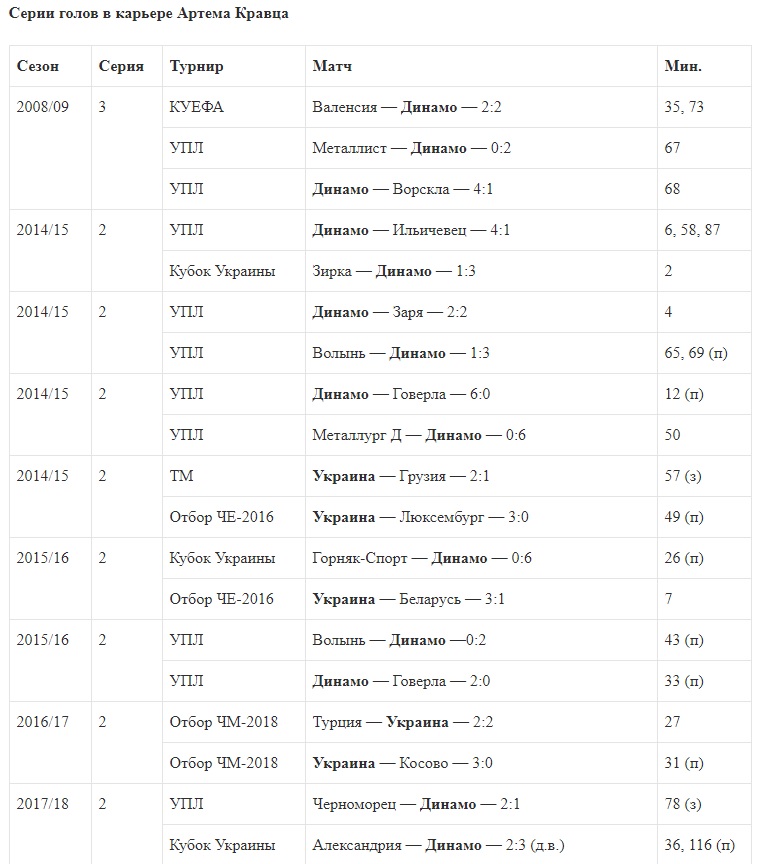 Забивные серии Артема захватили семь сезонов. Больше всего их было в самом результативном для футболиста сезоне-2014/15 — четыре. В нынешнем зафиксированы уже три «стрика». Шесть серий пришлись на Динамо, четыре — на Кайсериспор, две — на сборную Украины. В одном случае Кравец сначала забил за бело-синих, а затем — за национальную команду.