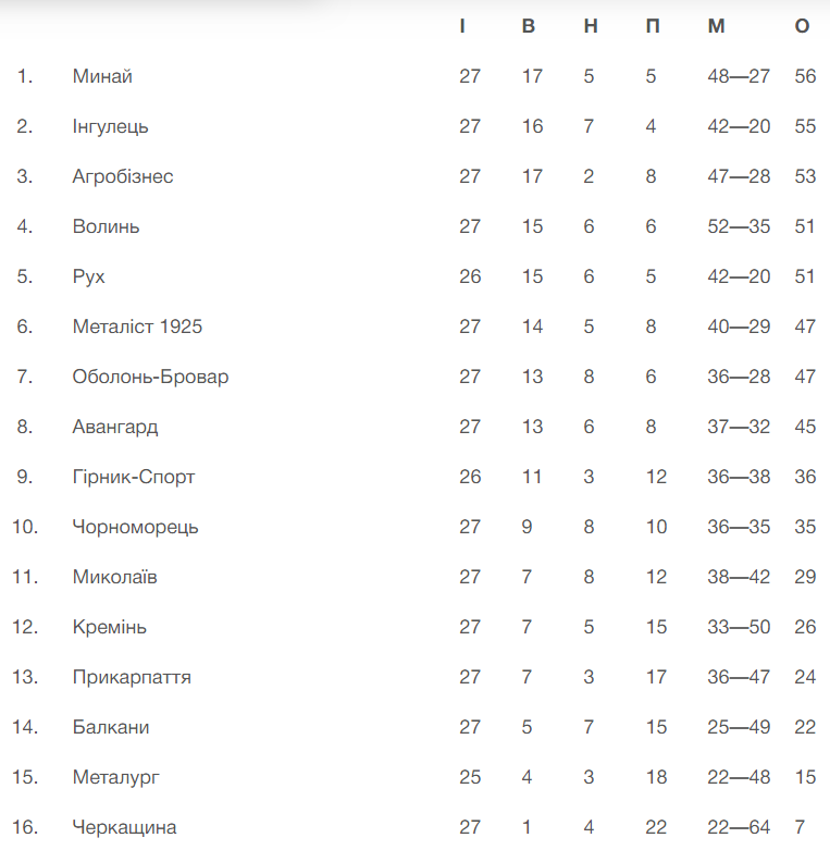Інші команди із чільної групи в середу очок не втрачали. Шоста поспіль перемога «Миная», цього разу над «Гірником-Спортом», дозволила йому очолити турнірну таблицю. Гості чинили впертий опір, наприкінці матчу навіть володіли помітною перевагою, проте не зуміли врятуватися від поразки. Долю протистояння вирішив влучний постріл капітана закарпатців Василя Піняшка в дальній кут на 42-й хвилині.