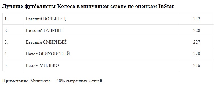 В завершившемся сезоне Колос провел 35 матчей в разных турнирах и выиграл только 12 из них. В двух случаях была зафиксирована ничья, в 21-м — поражение. Забито 38 мячей — 1,09 за игру. Пропущено 61 мяч — 1,74 за игру. В этих поединках тренеры задействовали 35 исполнителей, а в заявку на матчи попадали 36 футболистов. Вашему вниманию — индивидуальные итоги для игроков Колоса в минувшем сезоне, пишет zbirna.com.