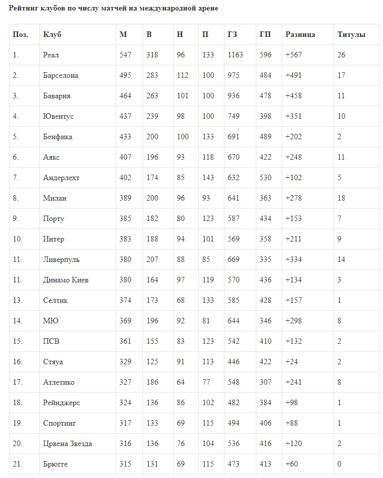 Отечественное первенство в этом списке представляет киевское Динамо. Бело-синие провели 380 матчей во всех турнирах и делят 11-е место с Ливерпулем.