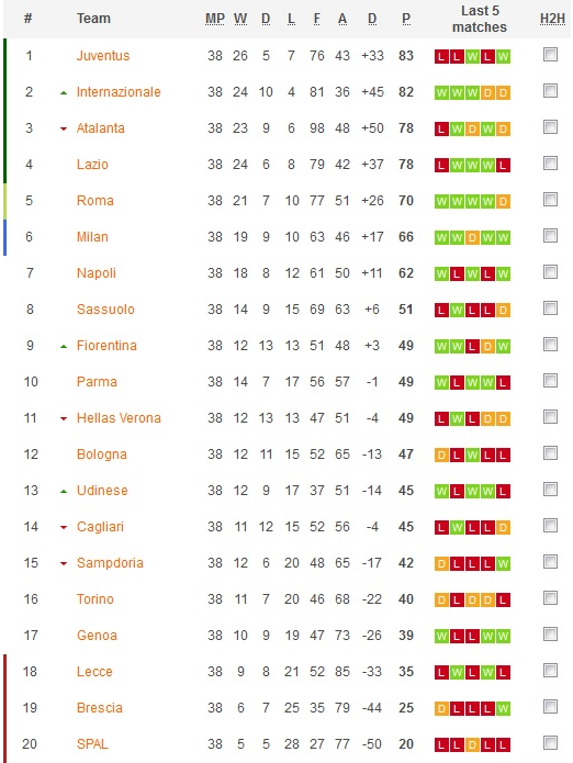 Чемпионом итальянского первенства стал "Ювентус". Туринцы, "Интер", "Аталанта" и "Лацио" квалифицировались в Лигу чемпионов. "Рома" и "Милан" - в Лигу Европы.