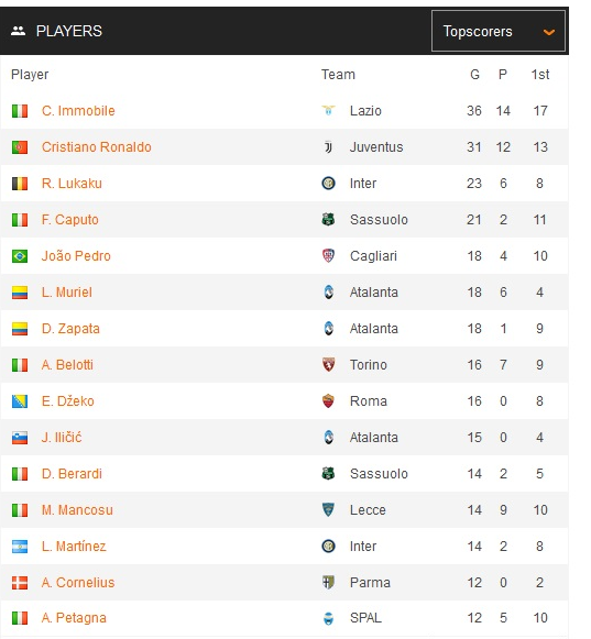 Лучшим бомбардиром чемпионата Италии с 36-ю голами стал нападающий "Лацио" Чиро Иммобиле. На втором месте Криштиану Роналду (31 гол), на третьем - Ромелу Лукаку (23 гола).
