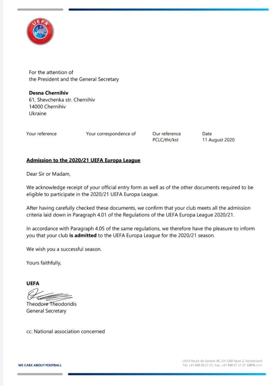 Телеграмм-канал Десны сообщает, что клуб официально был допущен к участию в Лиге Европы сезона-2020/21. Таким образом, черниговчане смогут дебютировать в еврокубках.