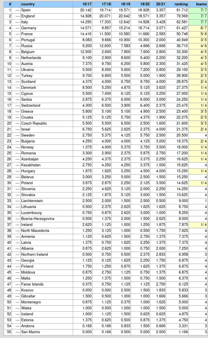 Таблица коэффициентов УЕФА 2021 (влияет на распределение путевок в сезоне 2022/23)