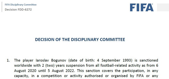 На основании данных, предоставленных Дисциплинарным комитетом БФФ, ФИФА распространила решение белорусской федерации на все соревнования под своей эгидой.