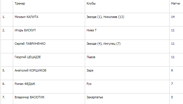 К слову, ни разу пока не добивались успеха подопечные Сергея Лавриненко (в 11 матчах) и Ивана Федыка (в 7). Но они еще имеют шанс «исправиться», поскольку продолжают пока работу соответственно с «Ингульцом» и «Рухом».