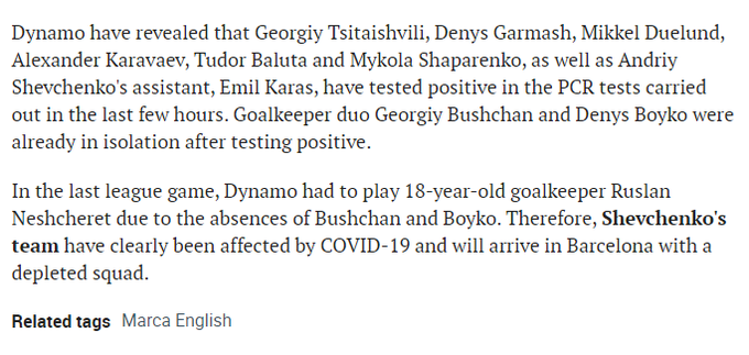В статье-превью матча Лиги чемпионов между «Барселоной» и «Динамо» журналисты Marca рассказали о заражениях украинцами коронавирусом и неожиданно написали, что киевскую команду тренирует Андрей Шевченко (который на самом деле возглавляет национальную сборную Украины).