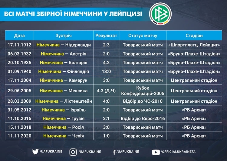Сьогодні в Лейпцигу на «РБ Арені» відбудеться поєдинок п’ятого туру групового етапу Ліги націй-2020/2021 Німеччина — Україна (початок — о 21.45 за київським часом).