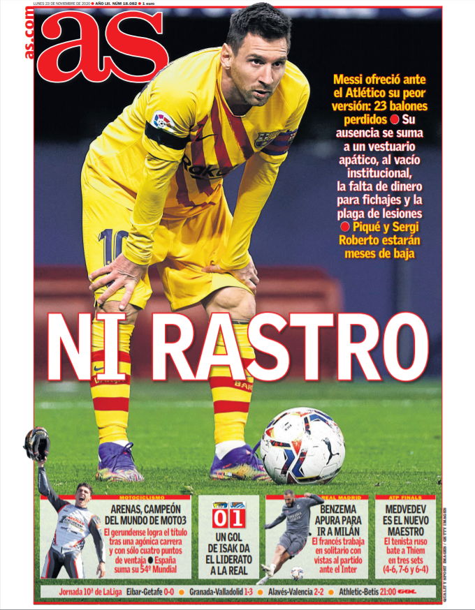 AS: «Лионель Месси больше не может нести на себе бремя лидерства в Барселоне. Аргентинец не добился успеха в игре и не поддержал партнеров после матча. Футболисты каталонского клуба уступили Атлетико и уходили с поля с опущенными головами — подавленные и ошеломленные.
