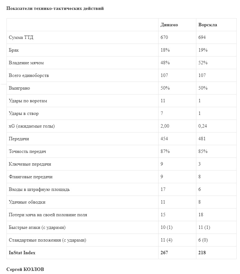 Динамо одержало далеко не самую сложную победу над Ворсклой и, судя по общему объему выполненной работы, затратило для этого не так много усилий. Самым полезным игроком поединка по оценкам InStat стал полузащитник киевлян Виктор Цыганков, пишет zbirna.com. В его активе было 63 ТТД с браком 22%, четыре обводки и три удара по воротам. Рейтинг эффективности игры хавбека сборной Украины, InStat Index, составил 324 балла. В тройку лучших футболистов матча также вошли Илья Забарный (303 балла) и Николай Шапаренко (296 баллов). Самый полезный игрок Ворсклы — Сергей Яворский (284 балла).