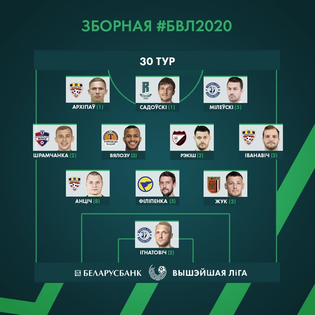 Белорусская федерация футбола опубликовала символическую сборную по итогам заключительного тура чемпионата Беларуси.
