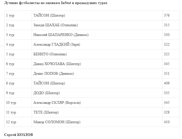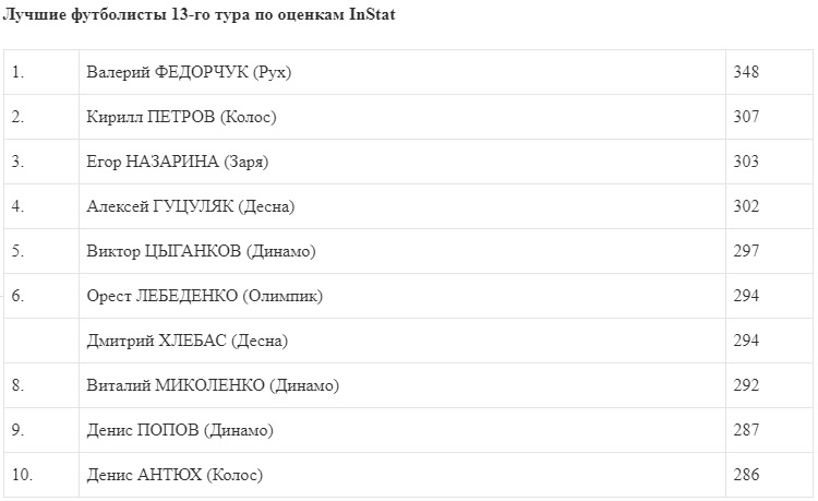 Валерий Федорчук - лучший игрок 13-го тура Премьер-лиги по оценкам InStat, три динамовца - в топ-10