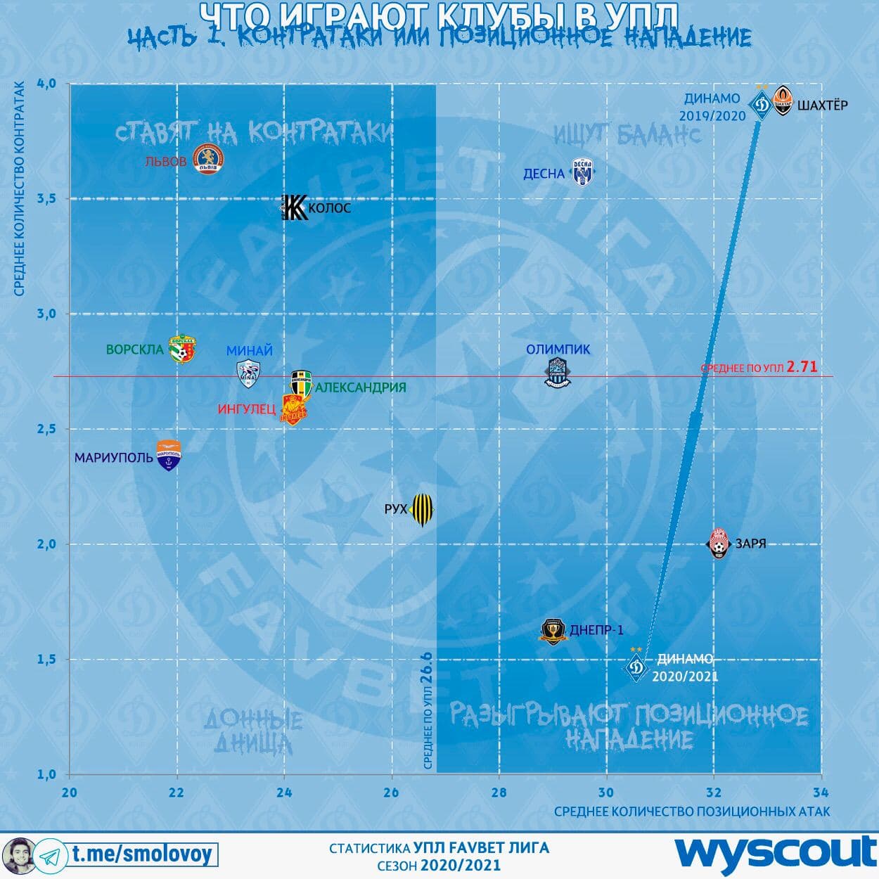 Спецом нанёс на диаграмму прошлогоднее Динамо Михайличенко (2019/2020) [правый верхний угол]. Разница колоссальная. Михайличенко требовал быстро доставлять мяч в атаку, с вытекающими плюсами и минусами. Сегодня требуют подходить к построению атак с умом. Приветствую!