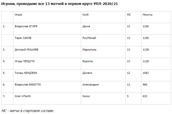 В осенней части сезона-2020/21 принимал участие 371 футболист: 300 украинцев и 71 легионер. Все 13 матчей провели только 7 игроков, 4 из которых неизменно выходили в стартовом составе. Среди отечественных исполнителей максимум времени пребывали на поле полузащитник «Десны» Владислав Огиря и защитник «Миная» Тарас Сакив, который в первом туре успел сыграть за «Рух», - по 1156 минут, а среди иностранцев - защитник «Динамо» поляк Томаш Кендзера - 1063.