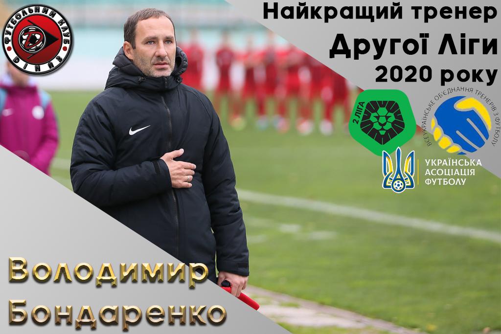 Четвертий рік поспіль наше Об’єднання визначає найкращого тренера Другої ліги за середніми оцінками тур за туром. За підсумками 2020 року найкращим із середнім показником 4,44 виявився Володимир Бондаренко – головний тренер вишгородського «Діназа», який привів команду до «зимового чемпіонства» у Групі «А» Другої ліги, а також здобув найкращий серед усіх учасників західноукраїнських команд дивізіону річний показник за очками.