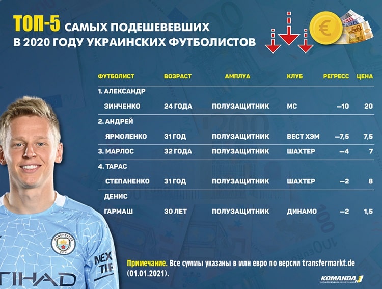 Зинченко, Гармаш и еще три самых подешевевших украинских футболиста в 2020 году
