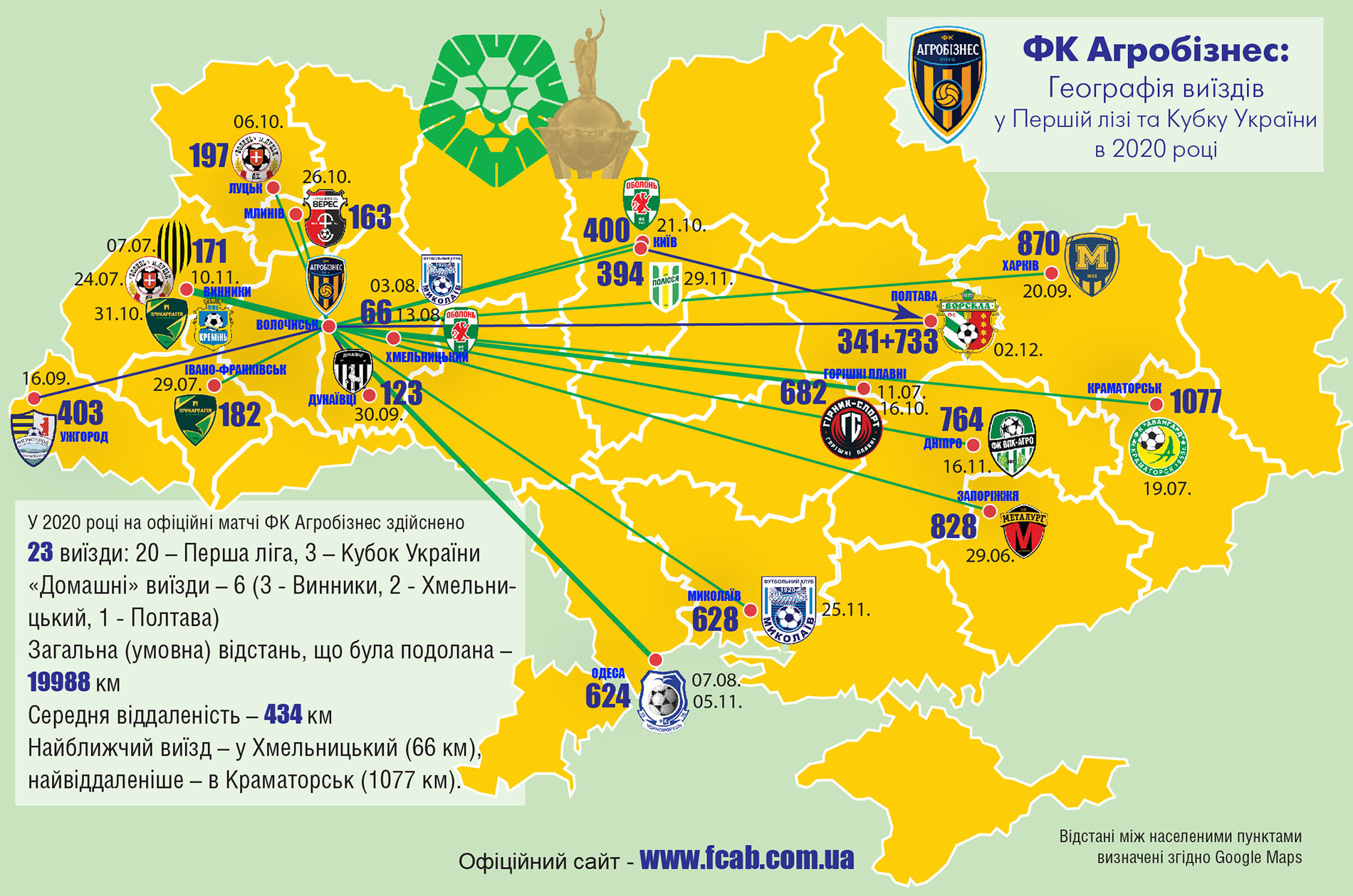 Цікаво, що майже всі вони відбулися у другому півріччі, адже через пандемію в Україні у першій половині 2020 року не грали офіційних матчів. З 29 червня до 2 грудня (п'ять місяців і три дні) футболісти ФК Агробізнеса виїжджали на матчі в 16 населених пунктів.