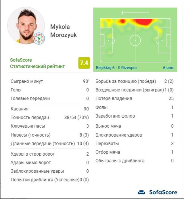 Трохи гірше виступив Микола Морозюк, який, тим не менш, став найкращим у складі своєї команди із оцінкою 7,4 (найближчий переслідувач набрав 6,8). Українець зробив три ключові передачі, 3 точних навіси, а загальна точність передач становить 70%.