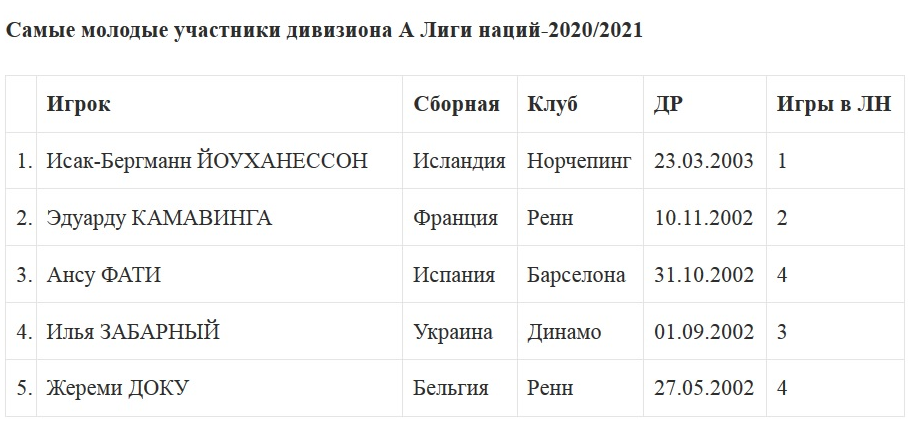 К подготовке к минувшему розыгрышу Лиги наций главный тренер сборной Украины Андрей Шевченко привлекал немало молодых исполнителей. Некоторые из них успели дебютировать и стать основными игроками национальной сборной Украины. Один из них — защитник Динамо Илья Забарный, который попал в Топ-5 самых юных участников дивизиона А Лиги наций-2020/2021.