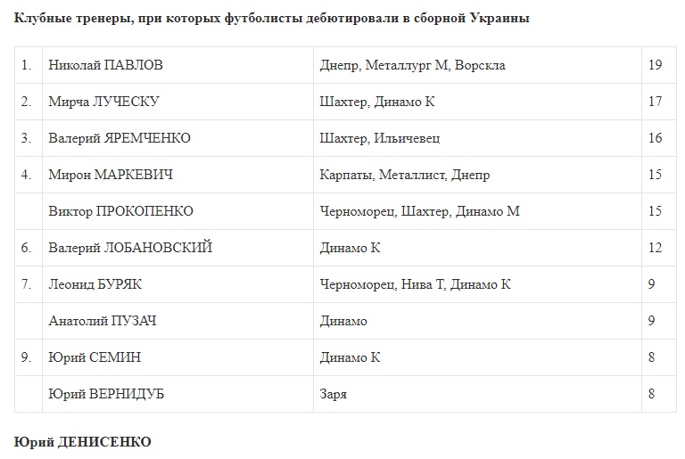 Удачные выступления футболистов в составах различных сборных во многом зависят от того, как их готовят в клубах. Сегодня мы снова решили напомнить, при каких клубных наставниках в национальной команде Украины дебютировало больше всего игроков. В этом рейтинге по-прежнему лидирует Николай Павлов, который делегировал в первую сборную страны 19 своих подопечных, пишет zbirna.com.