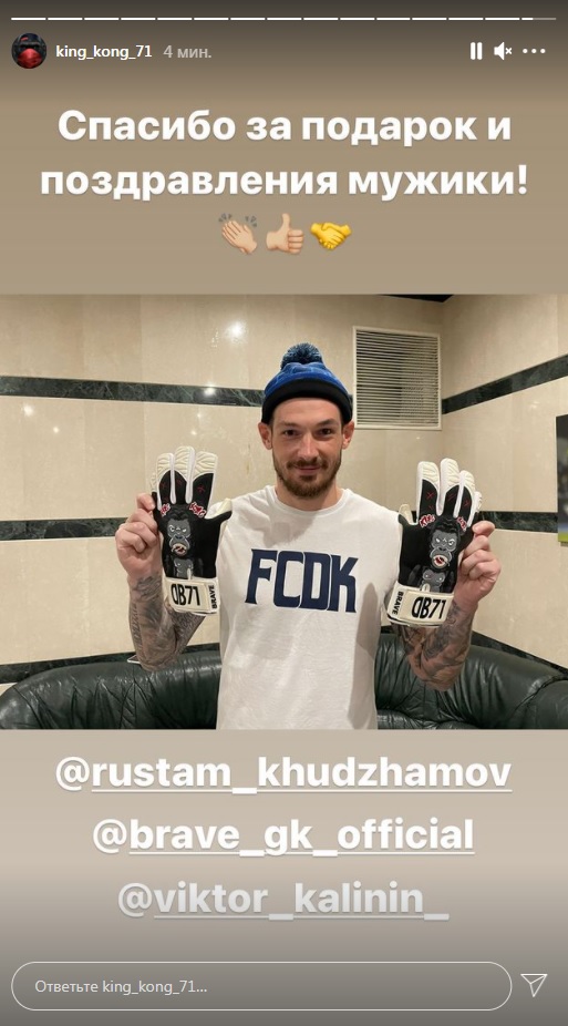 Голкипер "Динамо" Денис Бойко, которому исполнилось 33 года, получил в подарок необычные вратарские перчатки - на них нарисован Кинг-Конг, имеется игровой номер и инициалы футболиста.