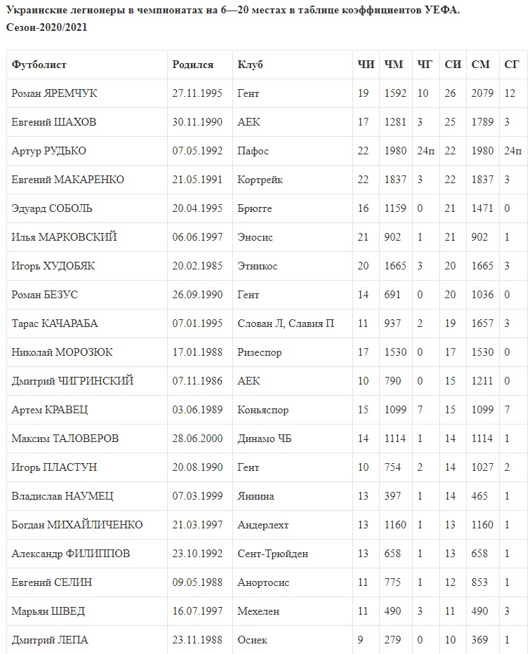 А теперь — обзор представителей европейских чемпионатов, которые занимают в таблице коэффициентов УЕФА места с 6-го по 20-е.