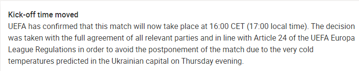 Сделано это для того, чтобы избежать переноса матча из-за очень низких температур, ожидаемых в столице Украины в четверг вечером.