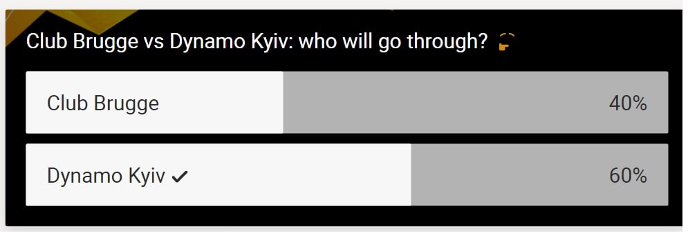 По состоянию на 8.00 (по Киеву) 24 февраля, 60% проголосовавших полагают, что дальше пойдет Динамо. Соответственно, 40% считают, что свой путь в ЛЕ продолжит Брюгге.
