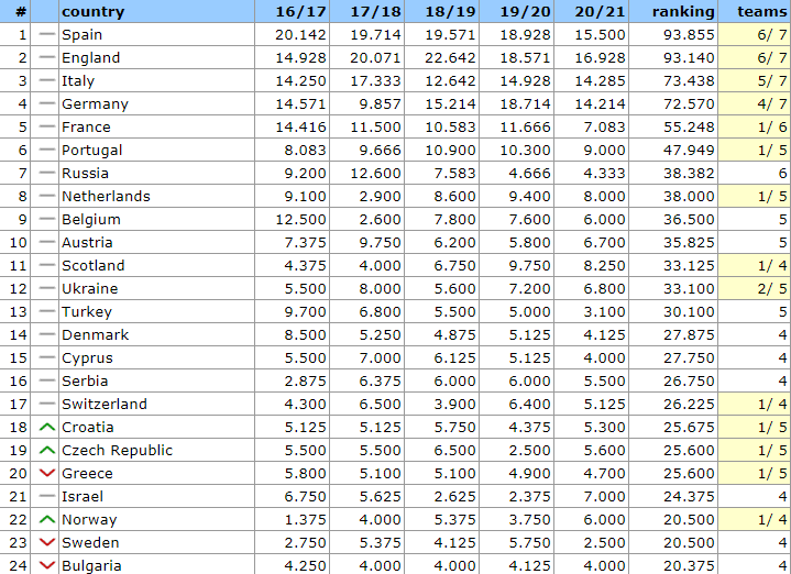 Також нагадаємо, що у сезоні-2021/22 чемпіон України точно потрапить в груповий етап Ліги чемпіонів, а от представництво країн на сезон-2022/23 формується прямо зараз. 12-е місце точно відкине Україну за цей бар’єр. А 11-й рядок ще залишить шанси, що наша країна і надалі точно матиме одного представника у групі ЛЧ. Якщо УЄФА не вигадає нові правила і формати...