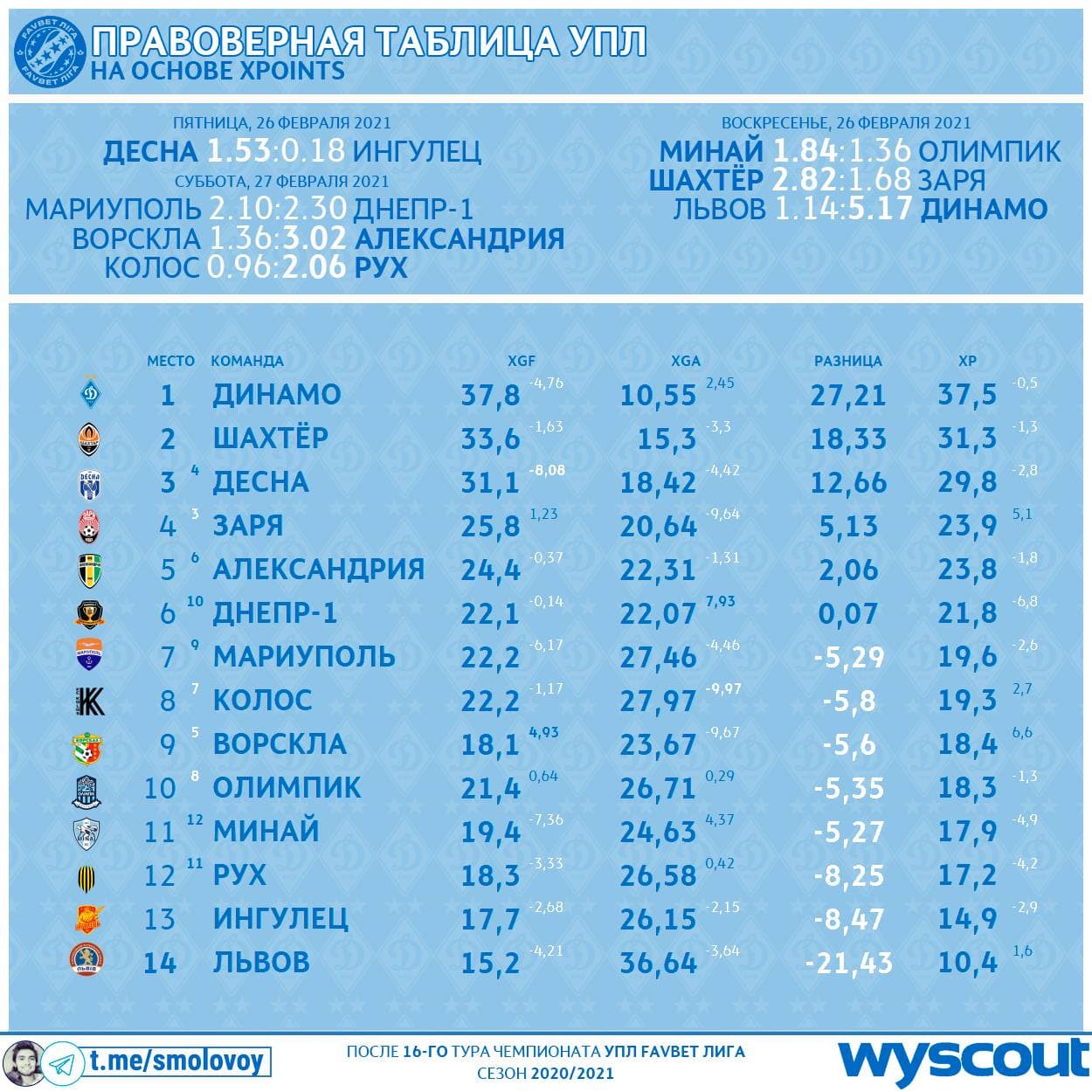 Все остальные забивают меньше, чем создают. Главных лузеров (Десну, Мариуполь и Минай) начинает догонять Динамо, которое уже недозабило 4.76 гола...