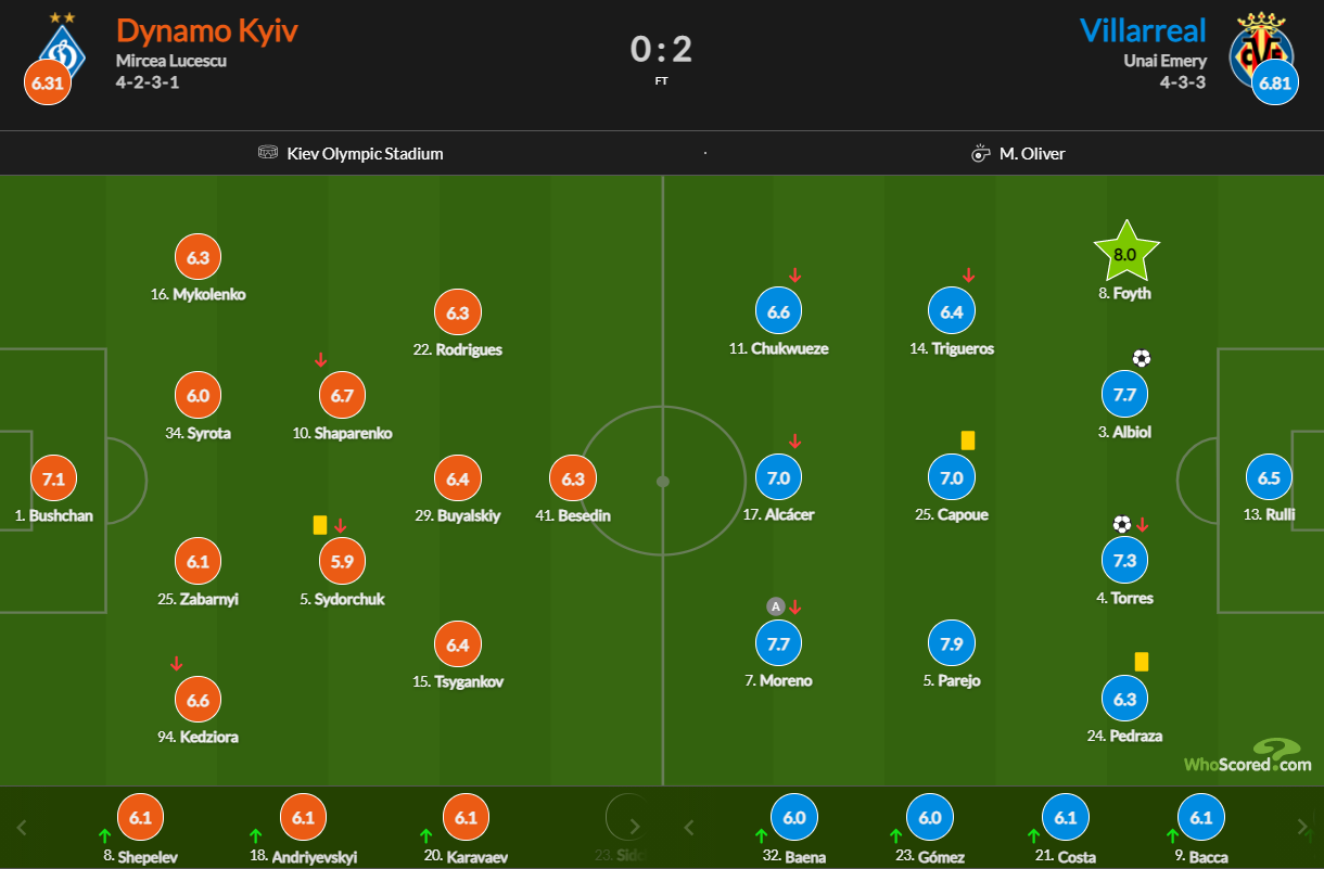 WhoScored оценил игроков первого матча 1/8 финала ЛЕ «Динамо» – «Вильярреал» (0:2).