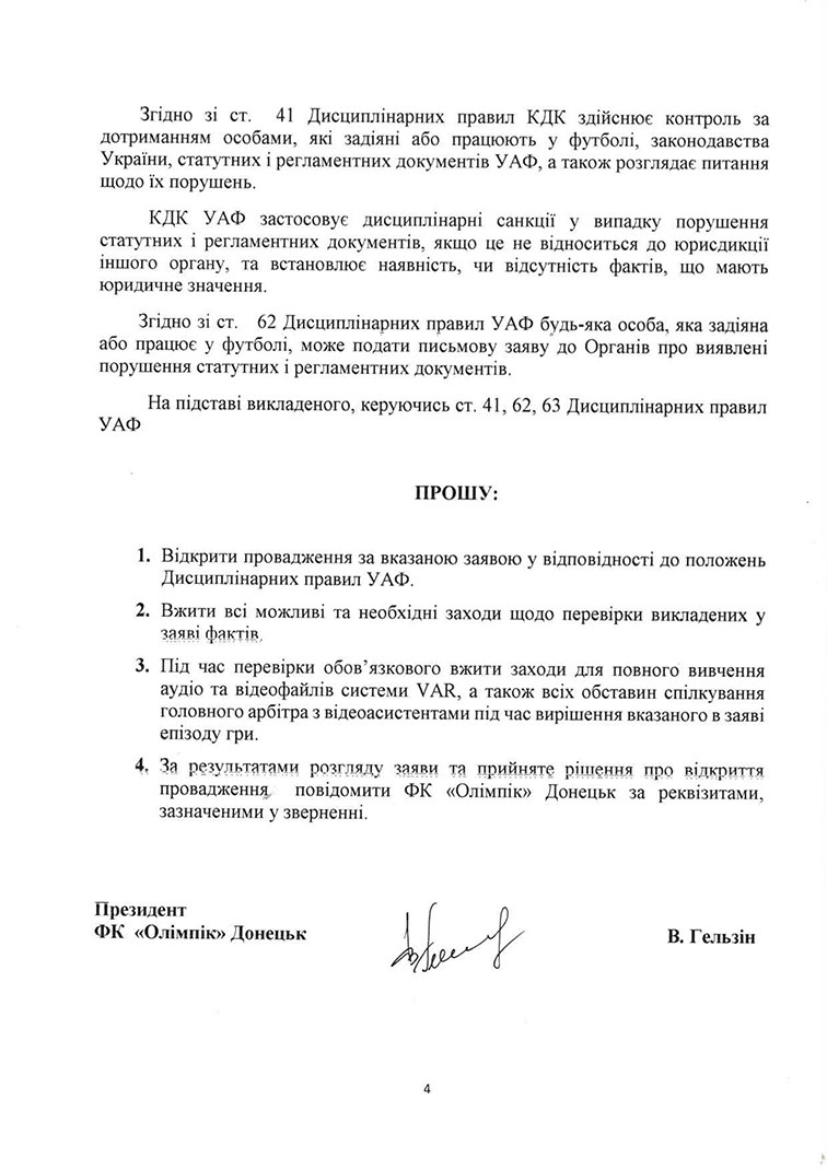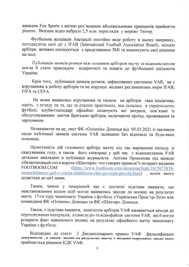 Еще 9 марта ФК Олимпик Донецк обратился в КДК УАФ с заявлением о проведении органом футбольного правосудия официального расследования всех обстоятельств скандальной отмены забитого гола в ворота Шахтера в поединке 17-го тура.
