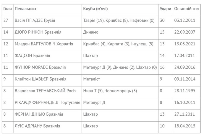 Легионеры, которые чаще всего забивали голы с отметки в Чемпионатах Украины (1992 - 15.03.2020)
