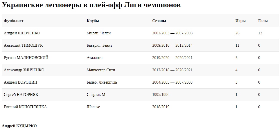 После матчей 1/8 финала Лиги чемпионов нынешнего сезона состоялись перестановки в рейтинге украинских легионеров в плей-офф этого турнира, пишет zbirna.com. Рейтинг, прямо скажем, очень скромный. В нем — всего семь фамилий. Печально, конечно, но наши футболисты не очень часто играли в составе клубов, которые могли себе позволить выйти в плей-офф ЛЧ.