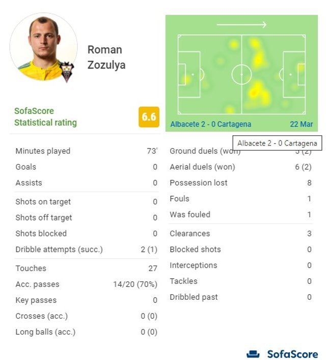 По перерві господарі забили вдруге. На 57-й хвилині Дані Торрес відібрав м'яч у чужому штрафному після непорозуміння захисника з кіпером, обігрався з Ортуньйо і вразив ворота Картахени. На 73-й Роман Зозуля пішов з поля, поступившись місцем Діаманка. Від Sofa Score екс-форвард збірної України отримав 6.6 – не найкращий поєдинок для 31-річного футболіста, хоча підсумковий рахунок навряд чи його засмутив.